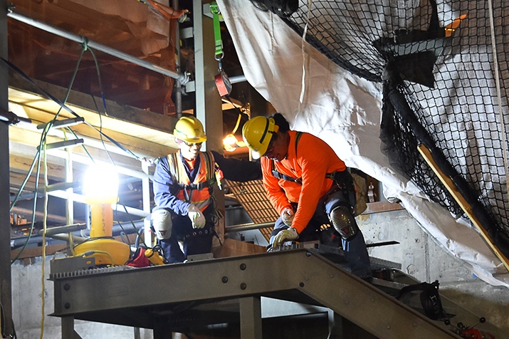 Much like the electricians, the carpenters focus on preparing the job site for the day shift, primarily setting up and removing the large and sometimes complex scaffolding. The ironworkers are erecting structural steel in the EMF and responsible for building permanent and temporary stairs. Laborers provide general site support.