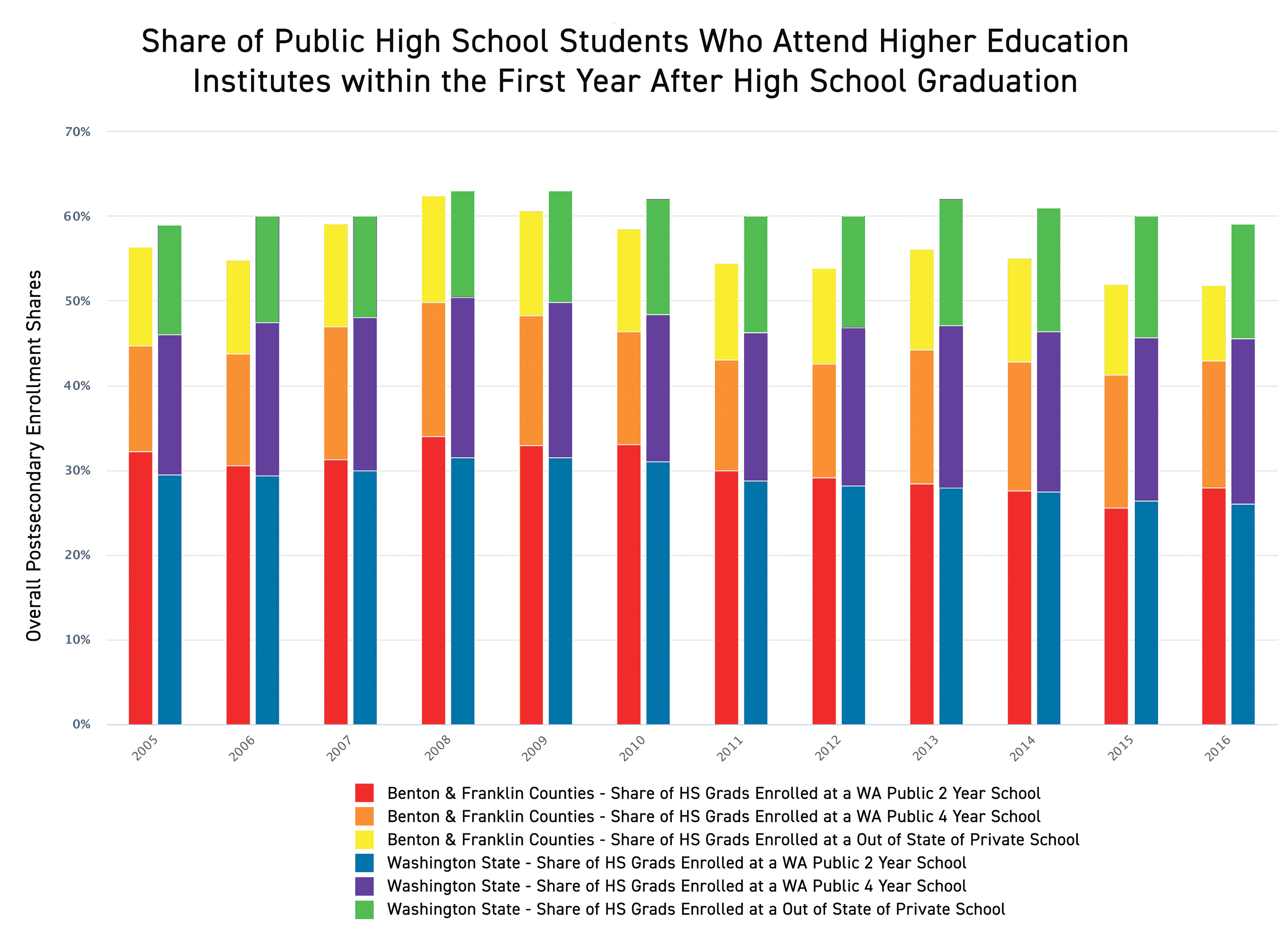 One has to start with the K-12 system, even though a high school diploma hardly gets anyone in the knowledge economy door. By one metric, high school graduation rates, which we can observe in the Benton-Franklin Trends data, some modest improvement can be celebrated. The extended rate is appropriate to consider in communities with a large number of English-language learners. Since the 2010-11 school year, the rate has increased by nearly 7 percentage points, with the most recent value at approximately 81 percent. Note, however, that success in the past several years has been stagnant. And also note that the local rate—averaged over all districts in the two counties—is still below the Washington average.