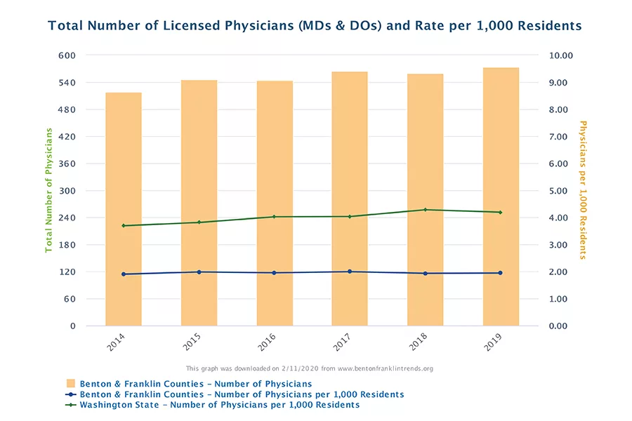 shows a gain of 28 physicians in the past five years in the two counties.