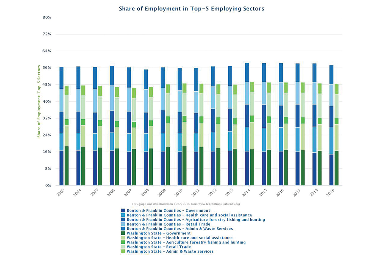 While the purest form of such externally-oriented sectors is tourism, local agriculture isn’t far behind. With a small population relative to the size of harvests and processed products, nearly all of Benton and Franklin counties’ food leaves the counties. (Of course, the greater Tri-Cities is in a unique and enviable position in that two of its other largest sectors — waste services and scientific services — also receive their revenue from beyond county borders.)
