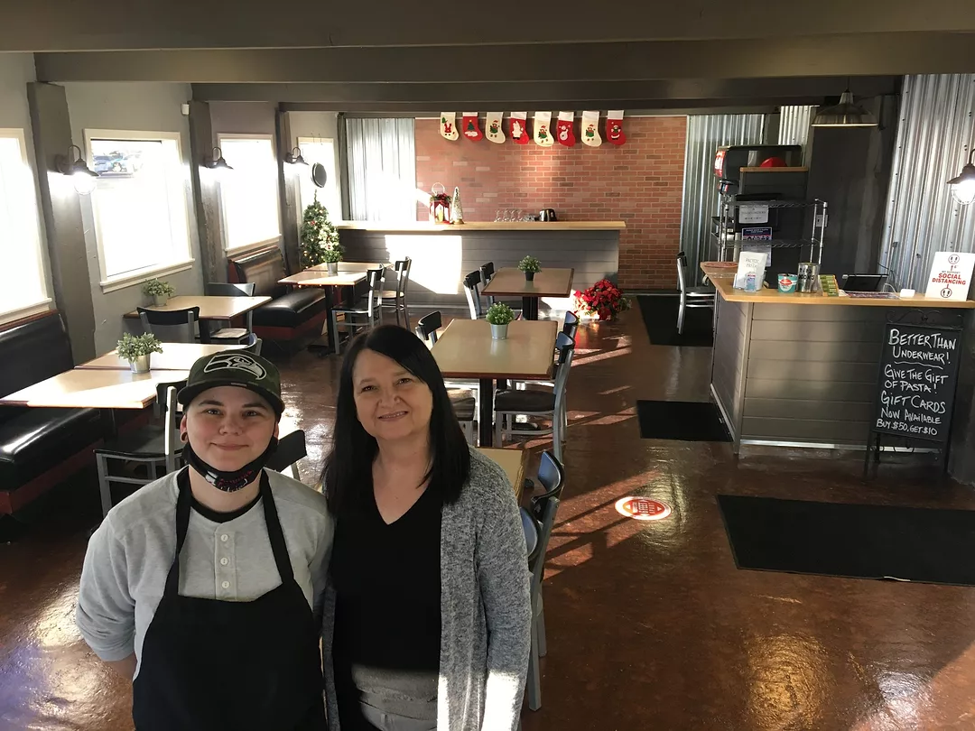 The mother-daughter team of Niki Young, left, and Mary Sue Hui stand in the dining room of their newly renovated restaurant Pacific Pasta & Grill at 603 Goethals Drive in Richland. They briefly removed their masks to be photographed. (Photo by Kristina Lord)
