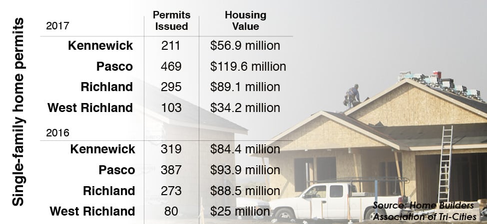 West Richland recorded the highest percentage of year-over-year growth at 29 percent with 103 home building permits filed in 2017, compared to 80 the previous year.