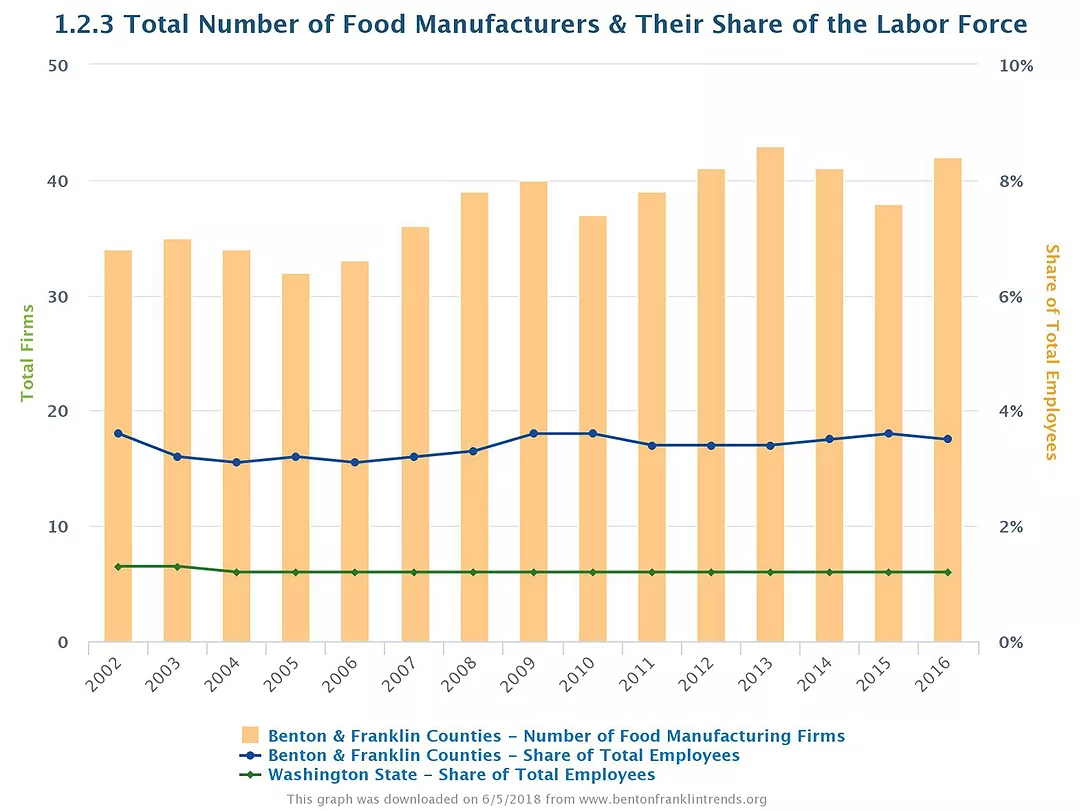 There are, to be sure, other manufacturing sub-sectors worth noting in the regional economy. In Benton County, primary metals manufacturing, as well as computer and electronic production, stand out. In Franklin County, non-metallic mineral products (cement, bricks) make a decent job showing. Still the manufacturing headline in the two counties belongs to agriculture.