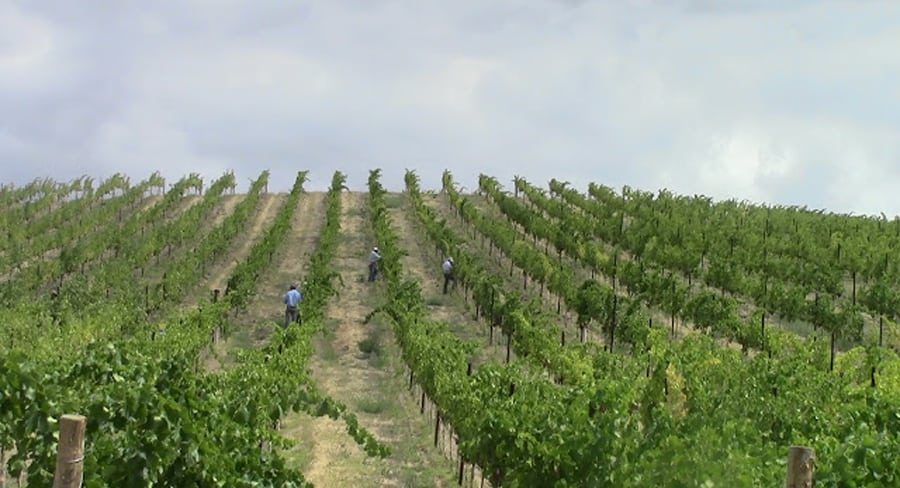 At this point, the berries pause in their growth for a couple of weeks. This is called lag phase. This allows a window for the grower to go out and harvest grapes from several vines in each block. The grower counts the clusters and weighs them, determining an average cluster weight. The lag phase weights are correlated to harvest cluster weights and this correlation is known from previous year’s data. Using this sample vine data, the grower can calculate the pounds per vine (or tons per acre). If the crop exceeds optimum target yield for that block crop, thinning will need to be done. Vineyard workers then will go out and remove a certain number of clusters per vine by hand to ensure proper ripening.