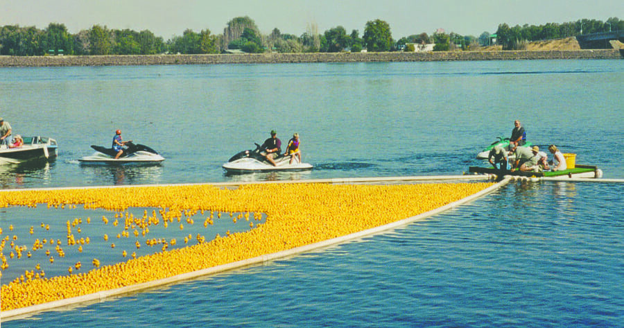 “When 40,000 plastic ducks are dumped into the river at one time, they sink under the surface and then blossom up like an atomic bomb expanding out in all directions,” McLean said. “We didn’t have any floating pipe to mark the outer boundary of the course, and many of the ducks got caught by the river’s current and off they went. We used jet boats provided by a local company to try to force them back onto the course, but that was only partially successful.”