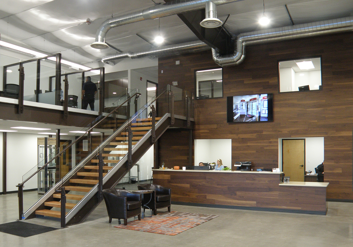 The building was transformed from a boat repair and workout facility into a fully functional office space on the second floor and showroom for the residential side of the glass company’s business on the first floor, in addition to a glass fabrication shop.