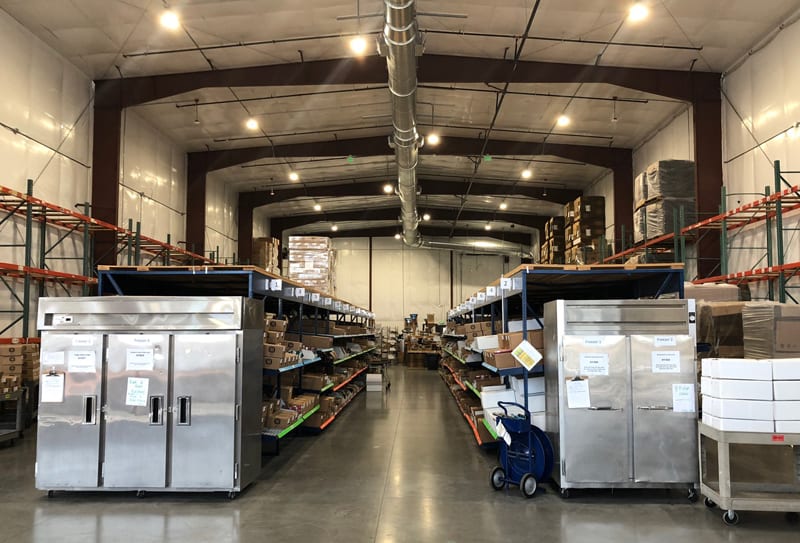 The new building features a high bay and modern exterior design elements. It was built using pre-engineered metal.