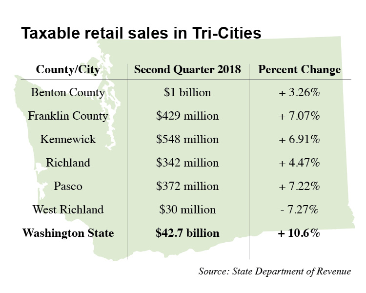 Kennewick’s taxable retail sales increased 6.91 percent; Richland’s increased 4.47 percent; West Richland’s dropped 7.27 percent; and Prosser dipped nearly 2 percent.
