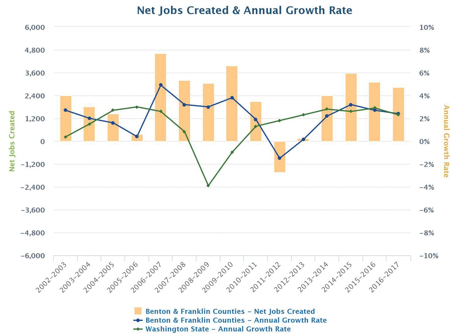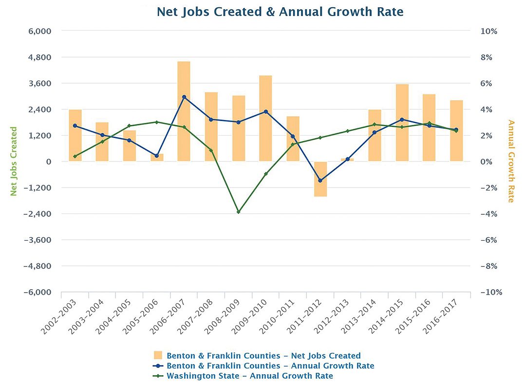 How has job creation in the Tri-City area unfolded over the past few years? Quite well, as Benton-Franklin Trends data reveals. From 2013-17, the local economy generated a total net number of nearly 12,000 jobs. The implied growth rate has been nearly identical to that of our state, a unique result in Eastern Washington. The count is net because it portrays a balance of jobs gained and jobs lost; at the local level, we don’t have a way of measuring only job creation.