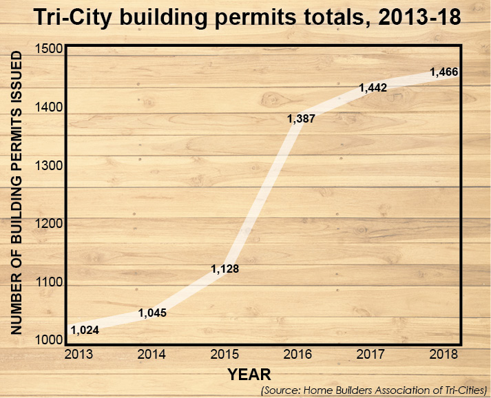 The building permit data comes from the Home Builders Association of Tri-Cities, which tabulates the number of single-family home permits issued in the two counties.