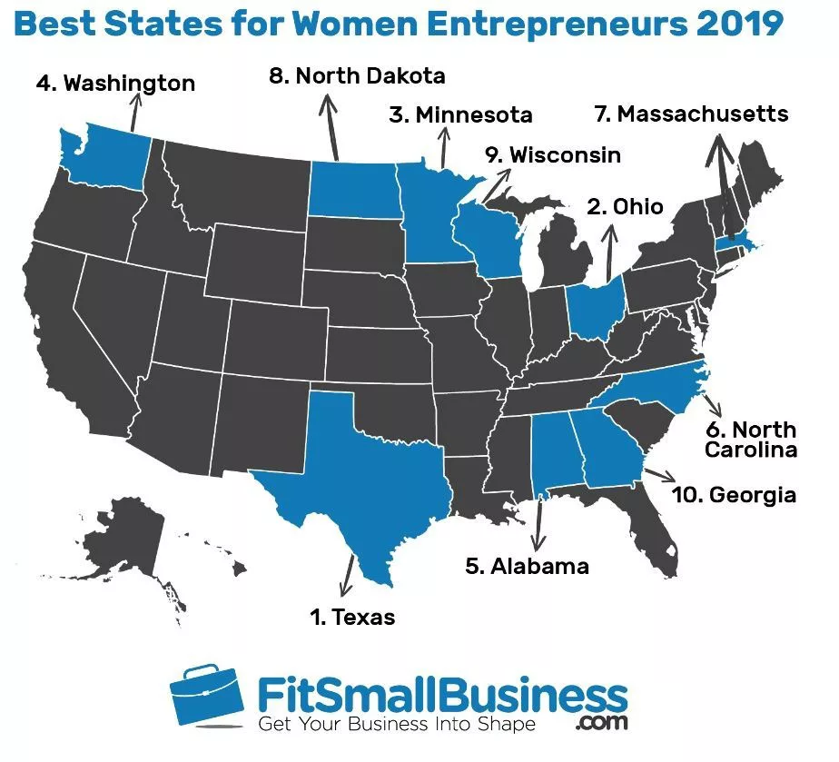 FitSmallBusiness.com ranked each state for its desirability and outlook for female entrepreneurs by reviewing the following overall criteria: general business climate and opportunity (25 percent), the number of female-owned business (25 percent), economic and financial health (25 percent), and safety and well-being for women (25 percent).