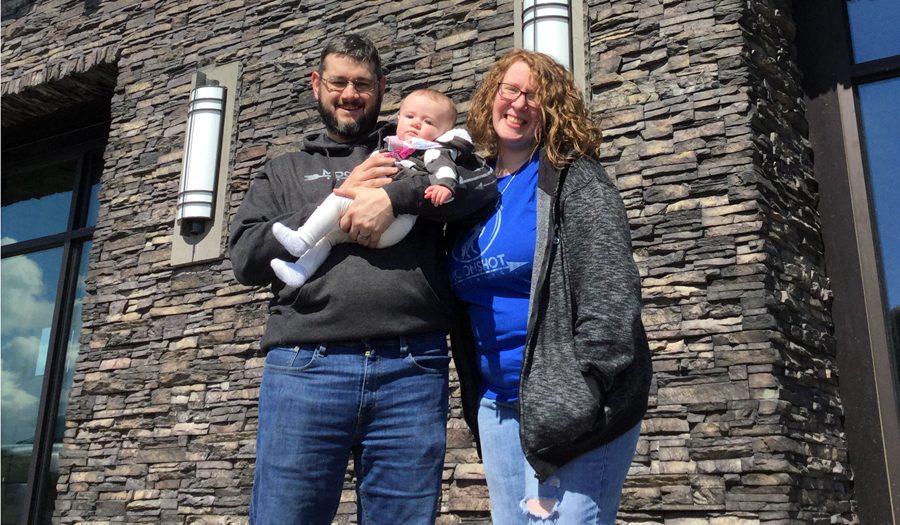 Ryan Wattenbarger and Hilary Bird stand with their baby, Norah, in front of Moonshot Brewing at 8804 Victoria Ave., Suite 130, in Kennewick. The couple plan to open the new soccer-themed craft brewery in May. (Photo by Jeff Morrow)