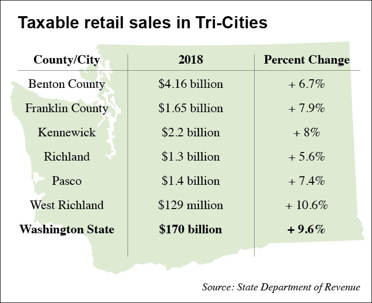 Benton and Franklin counties recorded $5.8 billion in taxable retail sales in 2018, a 7 percent gain over the previous year.