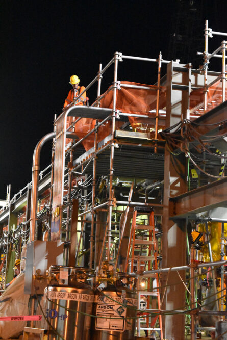 Much like the electricians, the carpenters focus on preparing the job site for the day shift, primarily setting up and removing the large and sometimes complex scaffolding. The ironworkers are erecting structural steel in the EMF and responsible for building permanent and temporary stairs. Laborers provide general site support.
