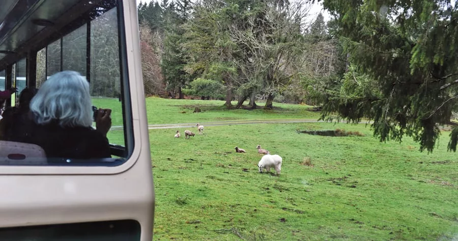 The park offers visitors a 50-minute narrated tram tour along a five-mile loop of its 435-acre free-roaming area featuring meadows, lush forests, and thick woodland trails. From the moment visitors hop on the tram, it’s like a game of Where’s Waldo. The immersive tour takes visitors just feet away from herds of American bison and Roosevelt elk, bighorn sheep, mountain goats, deer, caribou and moose and one moose, and spotting them is half the fun. A knowledgeable naturalist guides you through the forest and offers interesting facts and information on the different free-roaming animals.