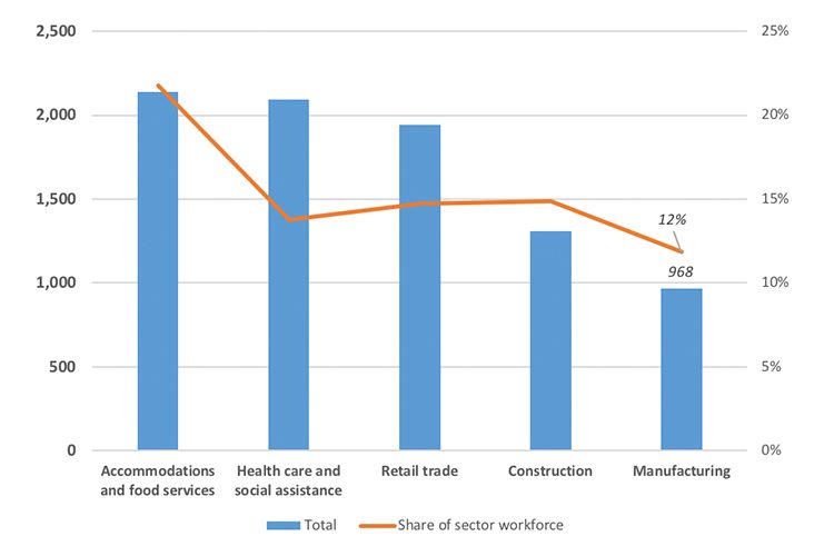 Local manufacturing ranked fifth for overall job losses at the end of May. Compared to the leading contributor for job losses, health care and social assistance, manufacturing was a distant fifth. And as a share of all those employed in the industry in 2018, manufacturing showed losses of 11 percent, also fifth lowest among the five largest sectors with losses.