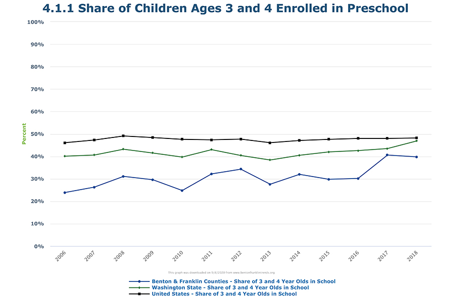 Benton Franklin Trends features an indicator that sheds some light on the usage of child care here. The accompanying graph shows that the share of 3- and 4-year-olds who attend preschool has consistently been below the state and the U.S. figures.