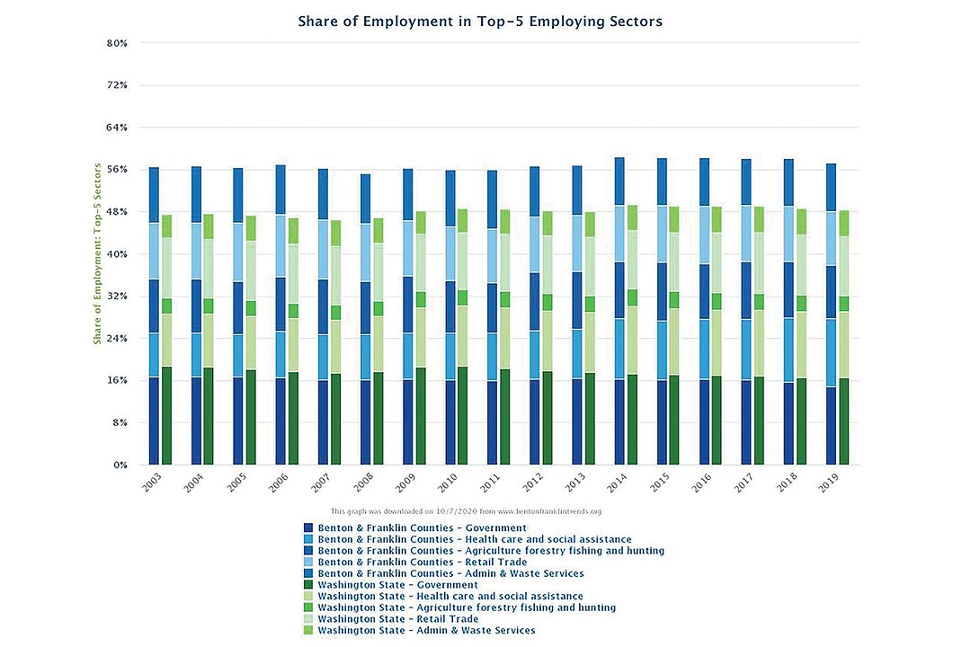 Roughly speaking, then, nearly 30,000 of the jobs in the greater Tri-Cities in 2019 were directly connected to food and agriculture. Out of a two-county labor force of nearly 127,000, that translates into an approximate share of 24%.