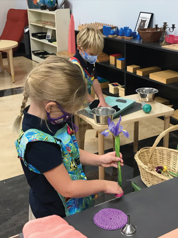 Montessori classrooms offer opportunities to learn fine motor skills to sew, grind coffee beans (not to be eaten), arrange flowers, polish wood and develop language skills with the use of a dollhouse.