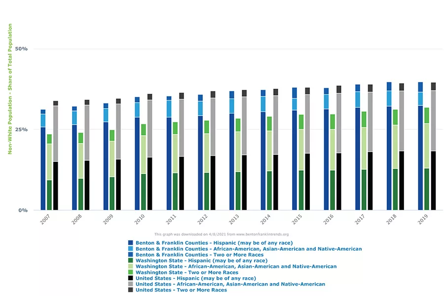 There is no other metro area in the state, outside of Yakima, with such a high percentage of people of color. This share is larger than that of Washington state, which registered an estimated total of nearly 32% in 2019. Note that the relative presence of minorities in the two counties now largely matches that of the U.S, in total.