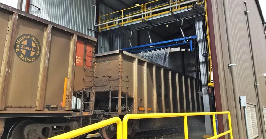 While the building is open, the sprayers get closer to the car and are also protected from strong winds. Only the coal within the train cars is sprayed — not the cars or in between the cars.