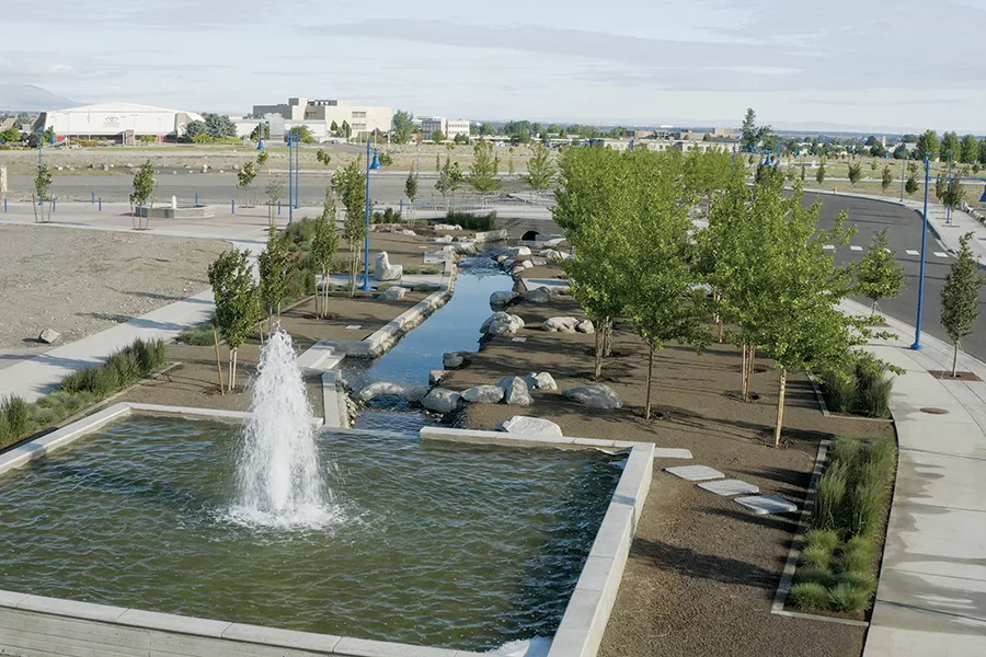 A key feature of the infrastructure includes a chlorinated stream running from West Deschutes Avenue north toward West Rio Grande Avenue. The water feature in the middle of the former airport includes trees, waterfalls, rocks, bridges, fountains, benches and walking paths.