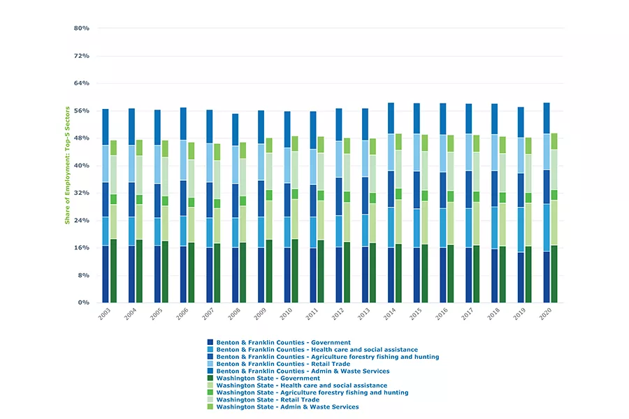 As Benton-Franklin Trend data illustrates, health care’s share of the two-county workforce clocked in at 13.8% in 2020. Compare that to its 2003 standing of 8.3%. It is now the second-largest sector in the local economy and no other sector in the greater Tri-Cities has grown as fast.