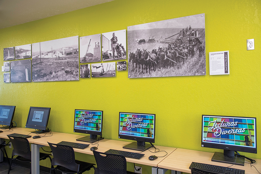 The remodel modernized the 1,850-square-foot library, which was built in 1993. The single-story building has front and back entrances and is jointly owned and operated with the city of Connell. It initially served as a city hall and fire hall. Inmates from Coyote Ridge Corrections Center installed the exterior brick façade in 1995.