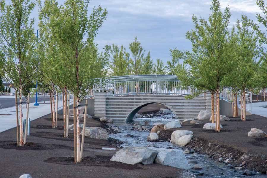 The project included an 850-foot linear water feature with fountains, as well as landscaping, streetlights and a set of new names for streets, including Crosswind Boulevard, a new route between West Grandridge Boulevard and West Deschutes Avenue.