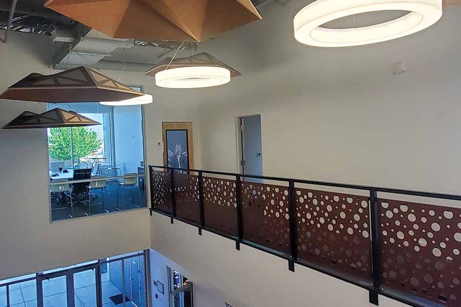 The design firm leased 6,335-square-foot on the second floor of the 12,874-square-foot structure, above the insurance office. The building boasts a modern vibe, glass-walled elevator, warm wood accents, an atrium and first-floor coffee shop, Rāǎn Coffee.