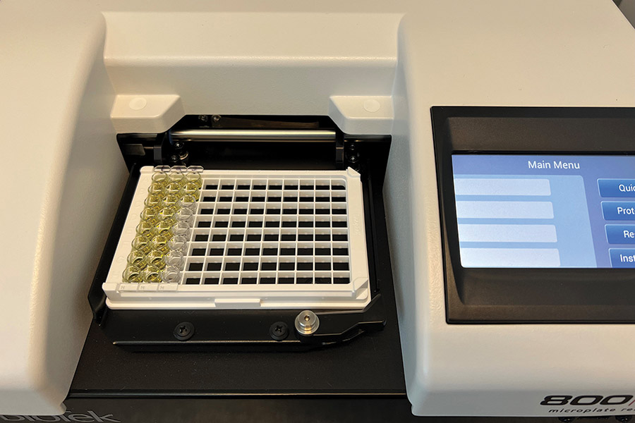 The ELISA system arrived in July. The test needs less than a drop of water – 50 microliters – to detect toxins. The plate reader reads color intensity to determine the level of toxins in the sample. “ELISA” refers to “enzyme-linked immunosorbent assay.”