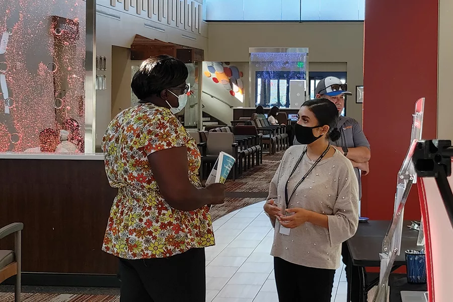 Recruiters Maria Zuniga and Tony Jiminez sat at a table by the entrance, company swag spread out before them at the Sept. 6 job fair.