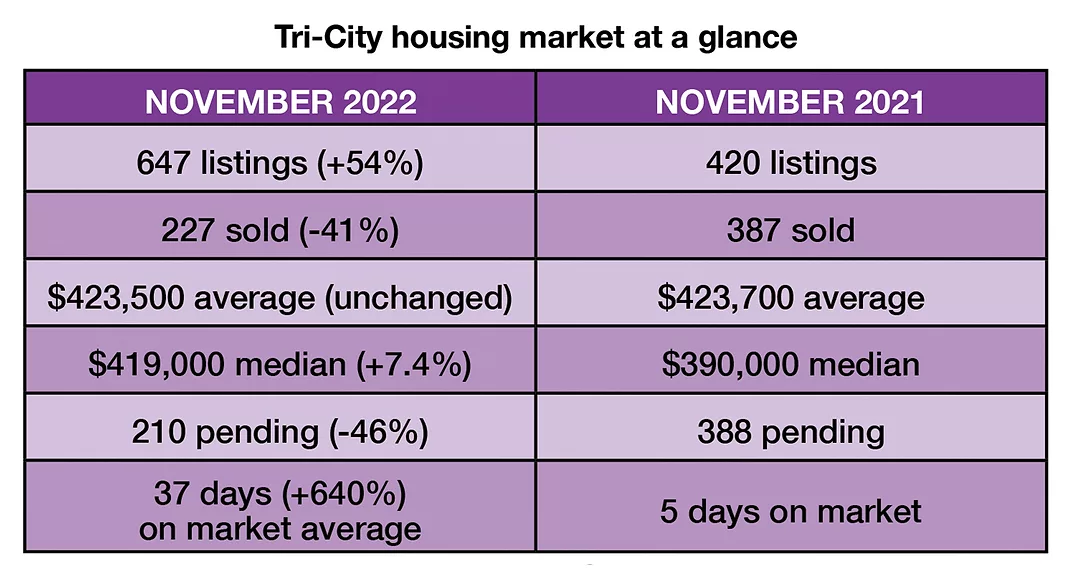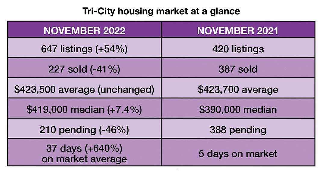 The number of homes on the market rose to 647 in November, the most of any month since September 2019, when there were 674. The Tri-City market is considered balanced with 1,200 for sale, so the shortage is real.