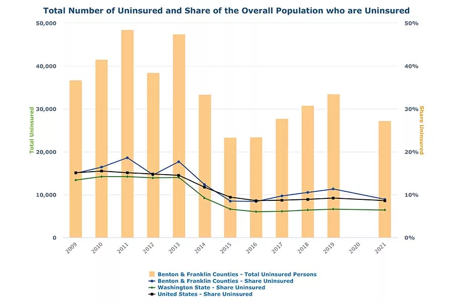 The overall average rate of the uninsured in the two counties over the 2017-21 period was 9.6%. For the large Hispanic/Latino population nearly twice as much, at 18.7%. This high rate of Hispanic/Latinos was, unfortunately, not unique to the greater Tri-Cities; nearly all central Washington counties show this disparity.