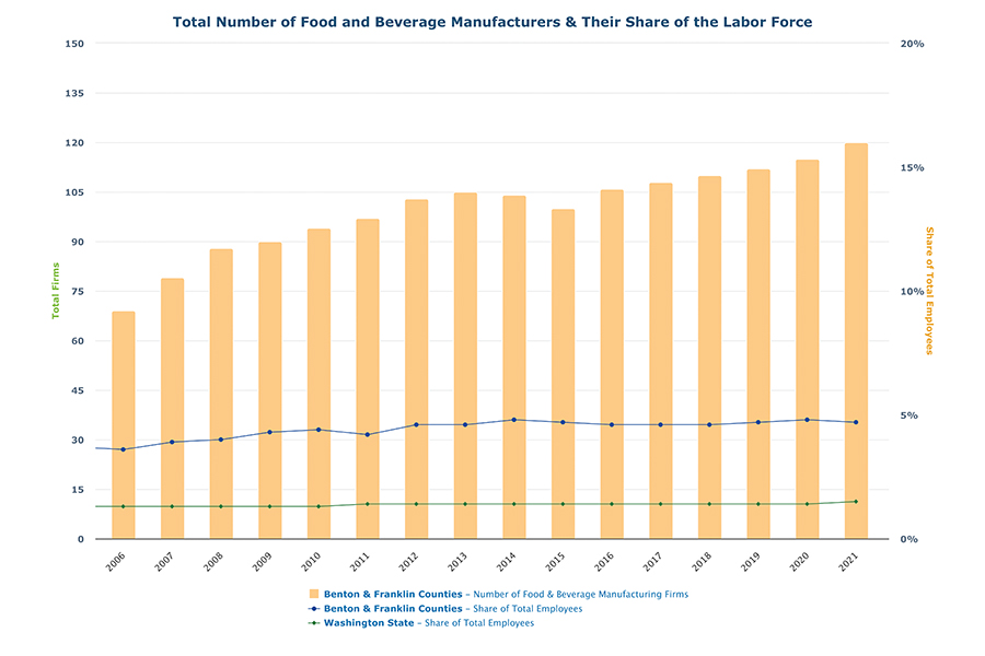 Manufacturing in the greater Tri-Cities continues to be a story of adding value to the region’s agricultural bounty. Benton-Franklin Trends data illustrates the growth over the past 15 years of food and beverage manufacturers.