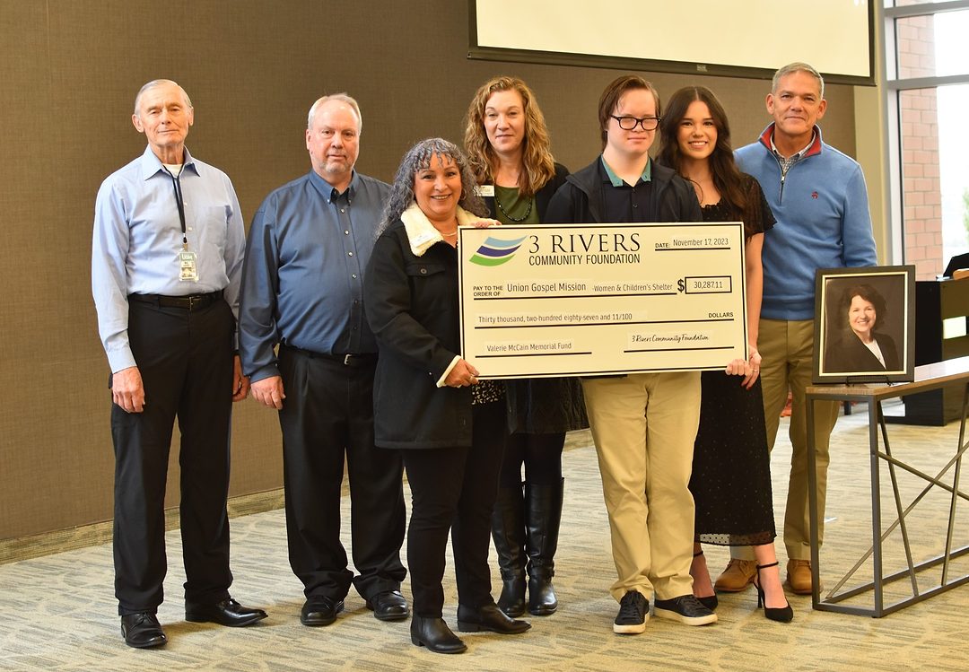 The 3 Rivers Community Foundation on Friday, Nov. 17, presented a check for more than $30,000 for the Tri-City Union Gospel Mission's capital campaign for a new women and children's shelter in Kennewick. The check came from the Valerie McCain Memorial Fund.