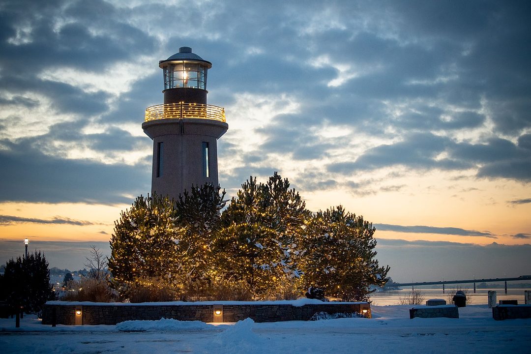 The Clover Island Lighthouse and surrounding area is lit up for the winter holidays.