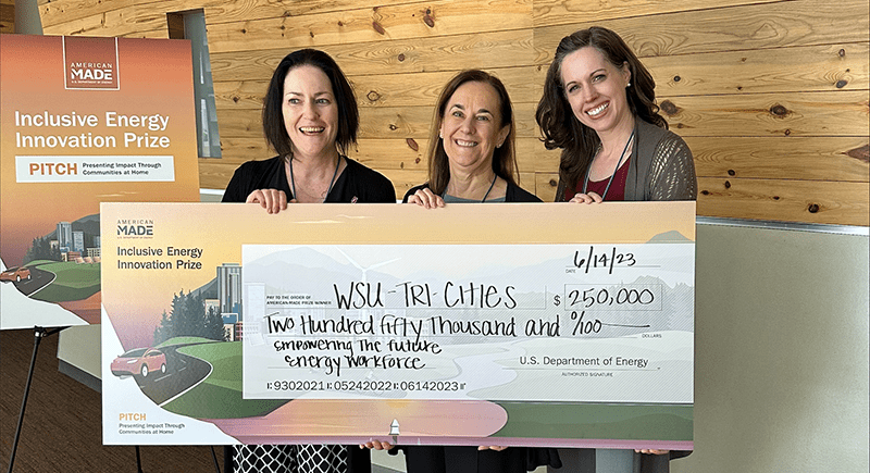 Washington State University Tri-Cities was named a grand prize in the U.S. Department of Energy’s Inclusive Energy Innovation contest, an honor that came with a $250,000 check. Pictured are the WSU Tri-Cities team behind the win, including, from left, Kate McAteer, vice chancellor for academic and student affairs; Chancellor Sandra Haynes; and Jillian Cadwell, research associate in the School of Engineering and Applied Sciences.