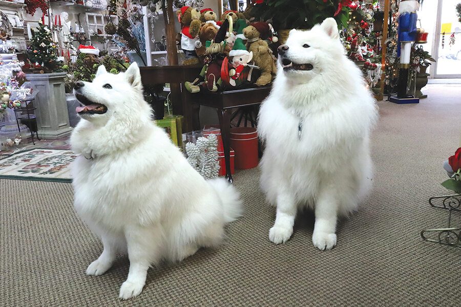 Tre’ and Mila, Samoyeds with eye-catching fluffy white coats, are the most popular employees at Buds...and Blossoms, Too in the Uptown Shopping Center in Richland.
