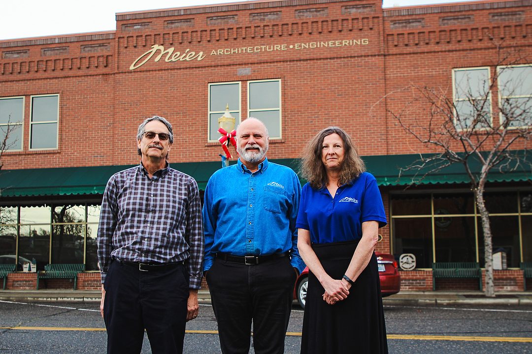 Paul Giever, from left, Ed Luebben and Bobbi Keen stand in front of their Meier Architecture and Engineering building in downtown Kennewick.