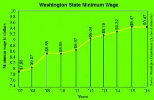 The hourly minimum wage is currently $9.47 and was on track to be $9.53 in 2017 and slightly more than $10 in 2018. Washington’s minimum wage increases almost annually based on a complicated formula involving the federal consumer price index.