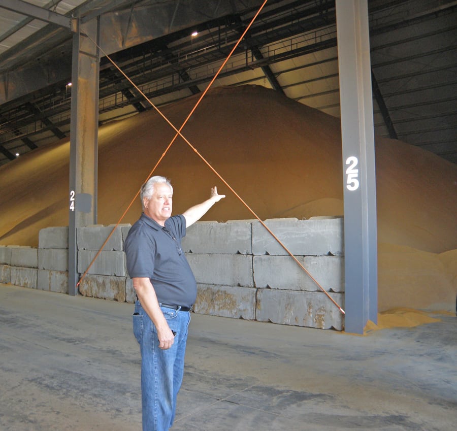 Outside are three separate 40,000-square-foot asphalt pads along with grain storage that will hold 10,000 tons of product. A sonar system monitors the grain volume.