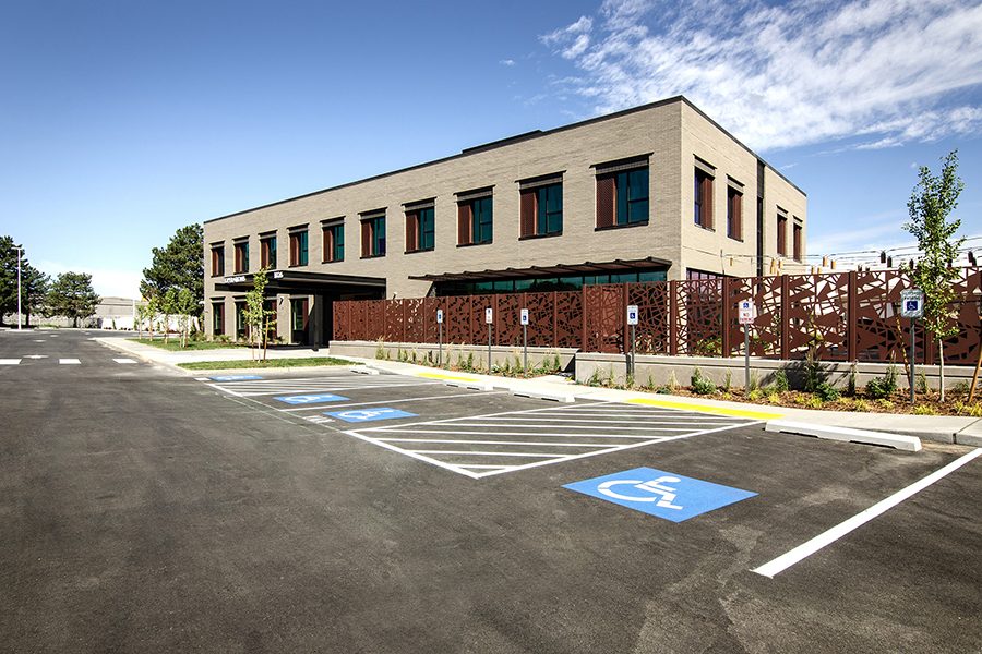The building features a decorative metal fence in outdoor grass and concrete patio between the administration and the new building. Landscaping consists of basalt rocks, small deciduous trees, local plants, flowers and concrete pavers.