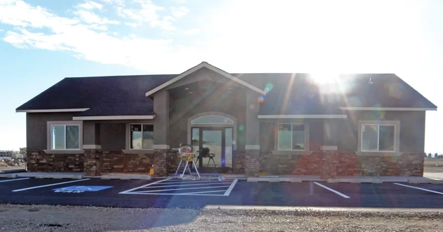 The single-story, 1,800-square-foot building features 10-foot walls, cathedral ceilings, a custom epoxy floor and a front exterior that’s stucco-wrapped with stone accents.