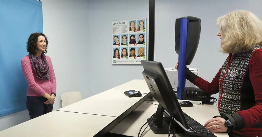 Pamela Byrd, state Department of Licensing district manager for a large region in Eastern Washington, snaps a new driver license photo of Kristina Lord at the Kennewick office in this 2016 file photo.