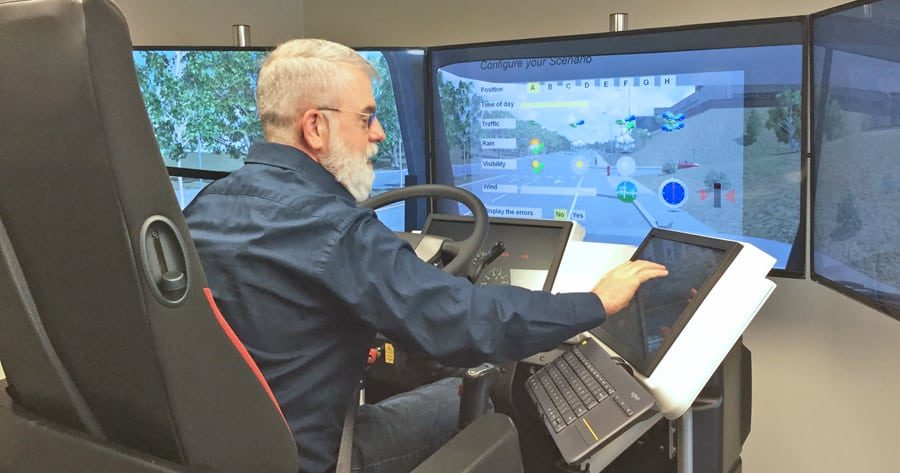 Stephens recently demonstrated the simulator, sitting in a driver’s seat and looking at three separate screens – a head-on view and two side-mirror windows.