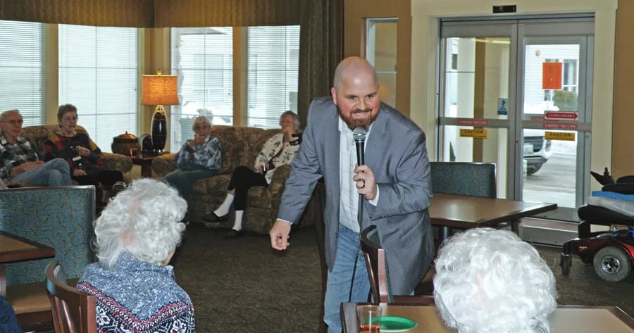 He talked about a “Do not move this piano” sign he saw at another assisted living facility, which had a grand piano in the lobby. He looked at the crowd of seniors and said moving it might be a funny prank, never mind that it probably weighed 2,000 pounds.
