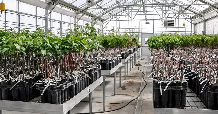It includes three separate growing bays with individual temperature controls that better duplicate temperature ranges where fruit tree viruses can thrive. This makes symptoms readily discernable, increasing the effectiveness of virus indexing. The facility also features work areas for potting and a walk-in cooler. A separate storage building houses equipment.