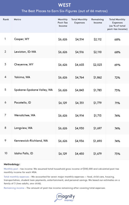 Kennewick and Richland are among the five Washington cities ranked among the best places in the West to live on six-figure salary, according to MagnifyMoney’s Best and Worst Cities To Live on a Six-Figure Income Report.