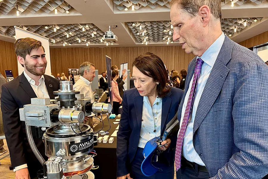 Avalanche Energy’s Richland facility will be a testing space for the company’s fusion technology as it works to scale up the machines. U.S. Sens. Maria Cantwell, D-Washington, center, and Ron Wyden, D-Oregon, right, view a replica of Avalanche’s fusion machine at the Pacific Northwest Energy Summit in July of 2024.